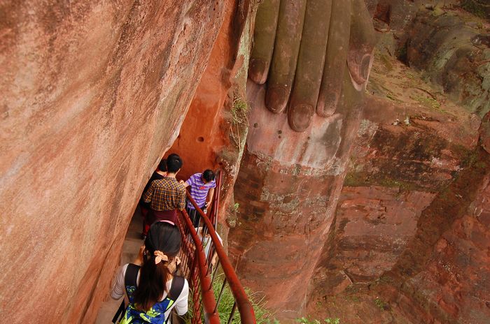 Turyści mogą na dwa sposoby zwiedzić to miejsce: łódką (wtedy można podziwiać posąg z daleka i zrobić typowo pocztówkowe zdjęcie) lub schodząc schodami na klifie od głowy pod same (wielkie) stopy buddy. My wybraliśmy ten drugi sposób, który umożliwił obserwowanie posągu na różnych wysokościach (a z różnych wysokości wygląda inaczej, wydawało nam się, że zwłaszcza wyraz jego twarzy zmienia się w zależności od wysokości, z której się patrzało). Schodząc klifem można również oglądać mniejsze posągi buddów wydrążone w niszach skalnych. Wrażenia tak wielkie, jak sam posąg :). Szkoda tylko, że budda cierpi z powodu zanieczyszczeń powietrza i erozji skały. Powoli robi mu się również zielony sweterek z roślinek.